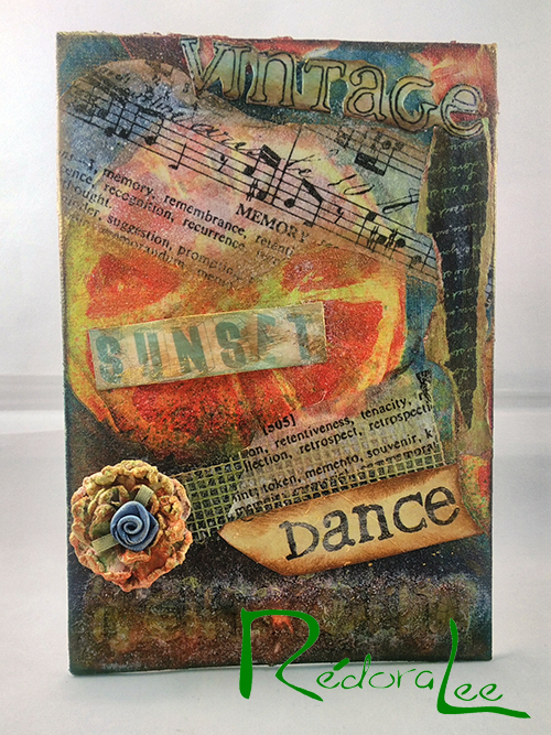 Creating mixed media projects is my great de-stresser! I love playing with paint, and the excitement of not really knowing how the final project will look is an elixer for me! For my canvas panel, I incorporated one or two of my favorite crafting techniques (Vintage and Decoupage) and then added some other de-stressors, such as listening to music, watching the sunset with my hubby, reading, and dancing! When I stress eat, I eat fruit, so I figured a big grapefruit would be appropriate. The word at the bottom of the panel is "Transform." I think I put just a wee bit too much crackle!